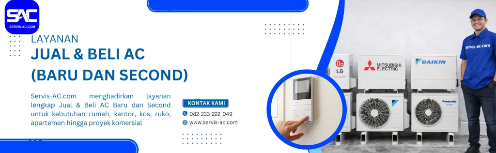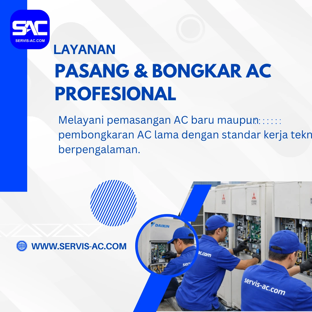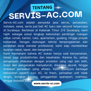 Servis-AC.com menyediakan layanan lengkap untuk kebutuhan pendingin dan kelistrikan di Surabaya. Kami melayani service AC split, standing floor, dan ducting meliputi cuci AC, isi dan tambah freon, perbaikan AC tidak dingin, maintenance rutin, hingga overhaul atau service besar. Selain itu tersedia layanan bongkar pasang AC, jual beli AC baru dan second, serta sewa AC harian dan bulanan untuk acara atau proyek. Kami juga melayani perbaikan kulkas, freezer, AC mobil, AC kapal, instalasi listrik, dan service genset. Didukung teknisi berpengalaman, respon cepat 24 jam, serta harga transparan, kami siap memberikan solusi terbaik untuk kenyamanan rumah, kantor, maupun usaha Anda.
